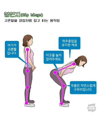 ●효과: 힙 힌지는 둔근과 허벅지 뒷부분인 햄스트링을 집중적으로 자극하여 하체를 탄탄하게 만든다. 골반의 움직임을 조절하는 능력을 길러주며, 허리 통증 예방에도 도움을 준다. 올바른 힙 힌지 동작은 허리의 과도한 굽힘을 막아주고, 체형 교정에 도움을 준다.