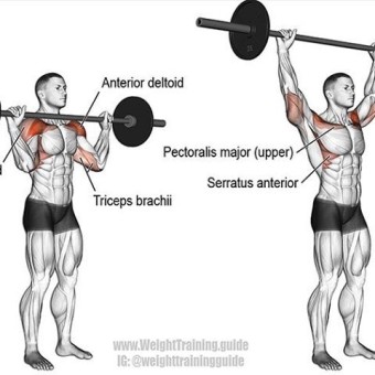 ●주의점: 바벨을 들어 올릴 때 어깨 관절에 지나친 부담이 가지 않도록 올바른 자세가 중요하다. 바벨을 들어 올리는 동안 어깨가 지나치게 앞으로 나오지 않도록 해야 하며, 바벨을 머리 위로 올릴 때 허리를 과도하게 젖히지 않도록 주의해야 한다.